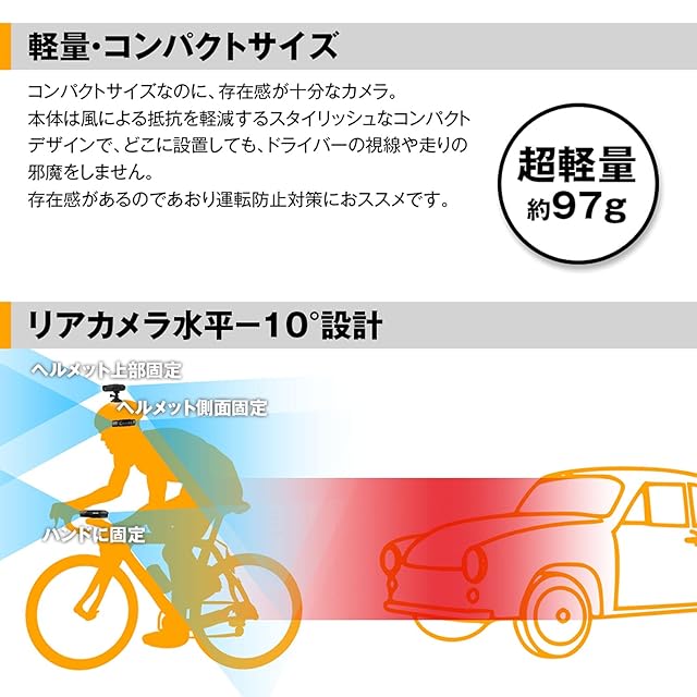 【取付マウント2種類付属】 簡単に取り付け・取り外しできるので盗難対策にも 簡単に取り外しできるヘルメット・ハンドル用マウントが両方付属。様々な角度調整が可能で、自由に向きをかえて撮影可能。 また、すぐに取り付け・取り外しできるので持ち運んで盗難防止。 ヘルメット装着/ハンドル装着、両方の撮影角度も考慮したリアカメラ水平-10°設計。