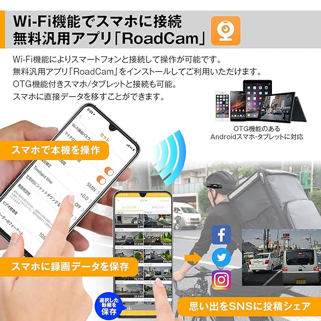 【2.4G Wi-Fi対応(技適証明済)&専用スマホアプリでその場で映像チェック】 カメラの設定変更など、離れた場所からコントロール 。 Wi-Fi経由でお使いのスマートフォンやタブレットで「撮影前のアングル確認」「録画中のモニタリング」「カメラのリモコン操作」可能。 また、撮った動画をスマートフォンやタブレットに転送し、SNSへの投稿や友達や家族とシェア。 もしもの時に大切な証拠はすぐさまにお持ちの設備に残せる。 また、アプリに接続時に自動で日時設定を補正されるため、手動で設定を行う必要なし。
