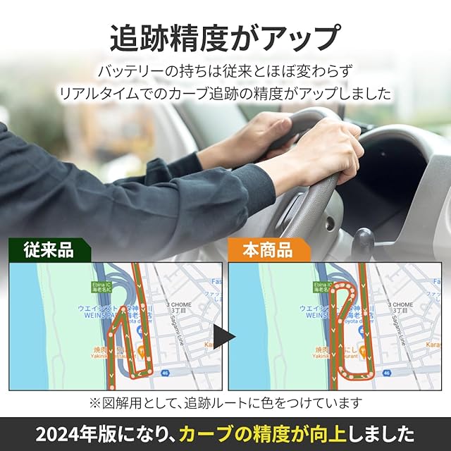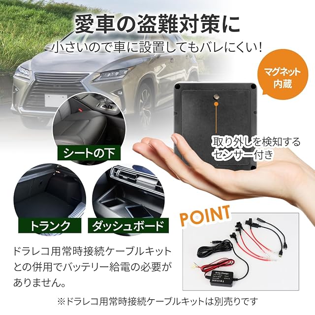4,000mAhものバッテリー搭載で長期間お使いいただけます。発信機のカーブ検知機能によりバッテリーの持ちと高精度を実現。停車中は自動的にスリープモードに切り替わり、車が動き出すと振動を検知して再開します。バッテリーの持ち時間は車の移動時間や頻度によって変動します。※別売りのケーブルキットと併用することでバッテリー切れの心配がありません。
