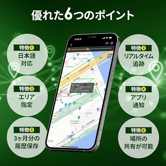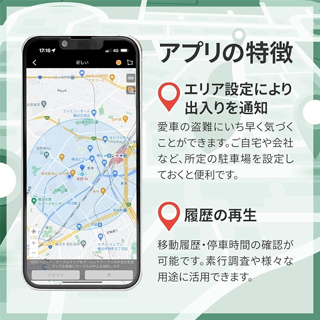 専用のアプリをお手持ちのスマホにインストールすることで、リアルタイムでの車両追跡が可能。さらに日本語対応・アプリ通知・3ヶ月分履歴保存・場所の共有など様々な機能が備わっています。予めエリアを指定しておくと、出入りした際に検知してアプリに通知される仕組みなのでいち早く盗難に気付けます。自宅・職場・駐車場の設定しておくと便利です。データは移動履歴や停車時間の確認が可能です。