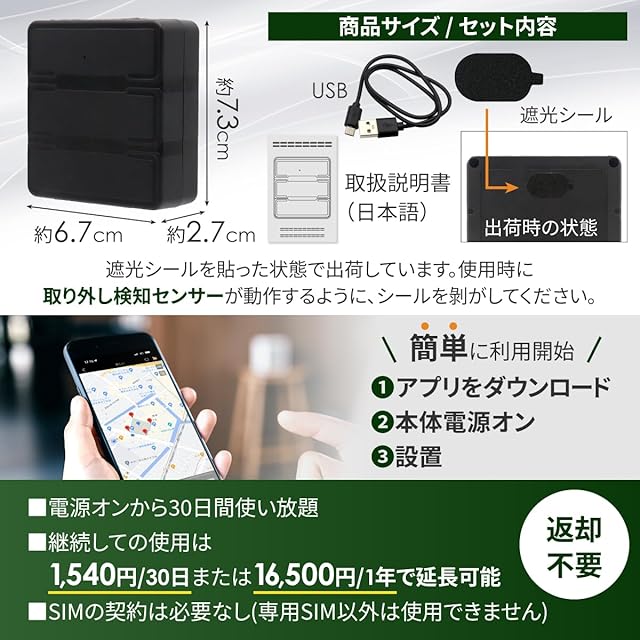 一般的なGPS発信機とは異なり、1度お手元に届きましたら以降は返却不要です。さらに面倒なSIM契約をすることも無いため、初心者の方でも気軽にご使用いただけます。使い始めてから30日間使い放題ですが、期間が過ぎても使い続けたい場合は「月額1,540円(税込)または年額16,500円(税込)」で延長できます。