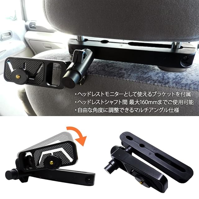ヘッドレスト用ブラケットとオンダッシュ用ブラケットが付属しているのでどちらでの使用にも対応しております。