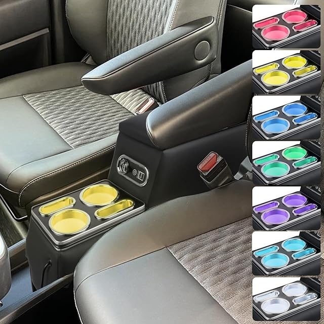 7色変換RGB照明&操作方法:ドリンクホルダーと携帯ホルダーに搭載された7色変換RGB照明。一つのボタンでお好みのカラーにライトアップ。毎日の気分に合わせて異なる色を選択可能。スイッチをクリックで点灯、クリックで色変更、ダブルクリックでグラデーション、5秒長押しで消灯。