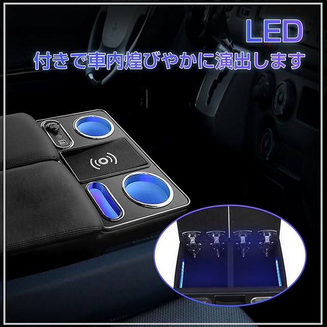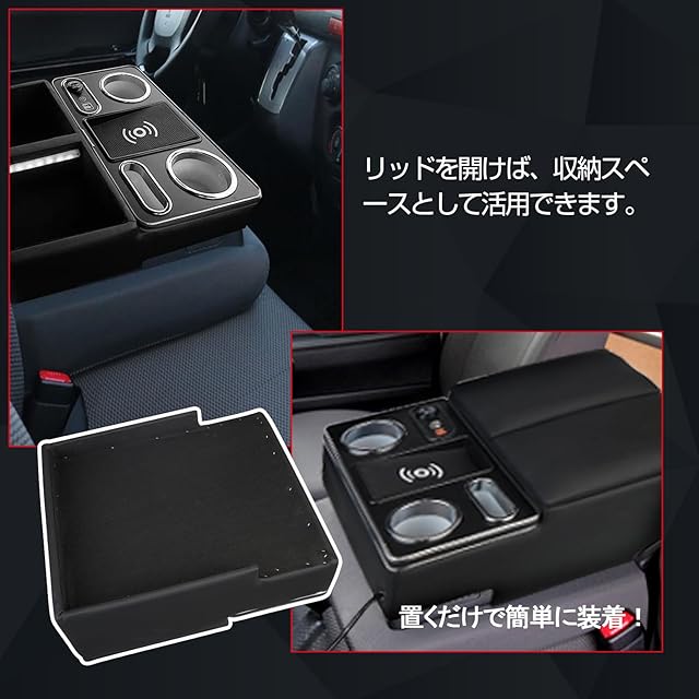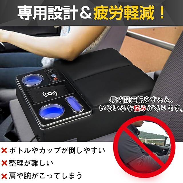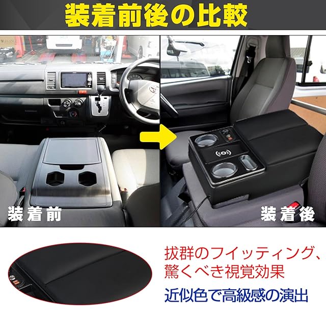 POWER PANDA 【ワイヤレス充電】トヨタ ハイエース 200系 VAN DX 専用 アームレスト レジアスエース 200系 バン DX コンソールボックス センターコンソール ドリンクテーブル カップホルダー HIACE/REGIUSACE 適用 パーツ 小物入れ 収納便利 肘掛け 肘置き 黒