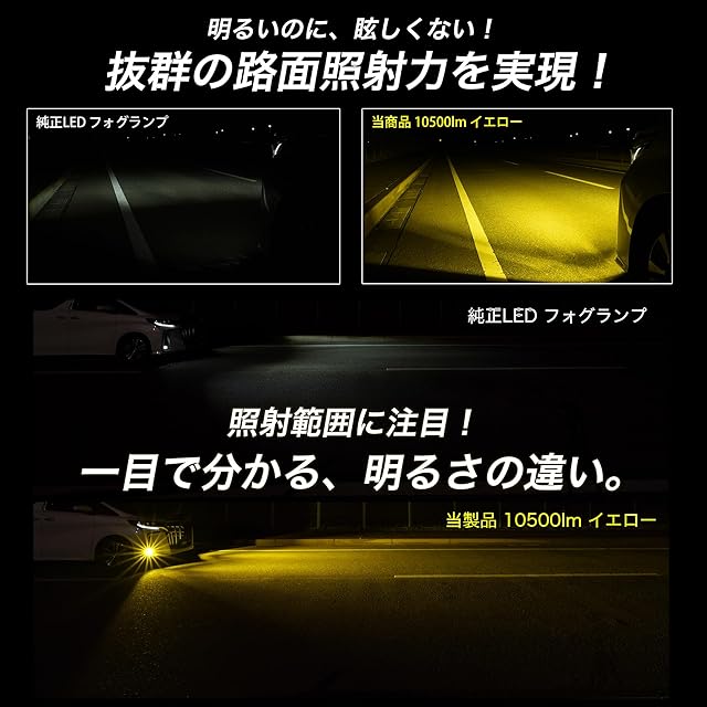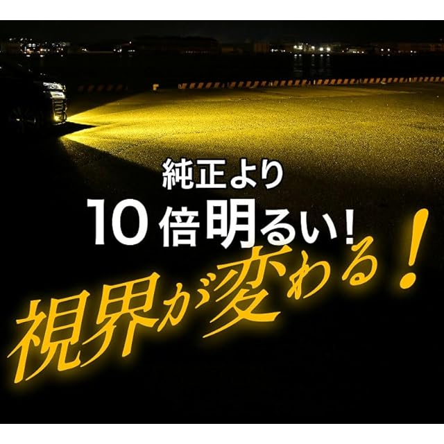【純正比10倍/実測値10500lm】日本国内の第三者機関で正確に測定された実測値10500ルーメンを実現。H8,H11,H16形状に対応し、純正バルブの約10倍の圧倒的な光量で夜間のドライブの安全性を高めます。この爆光による路面への照射力の違いを体感してください。