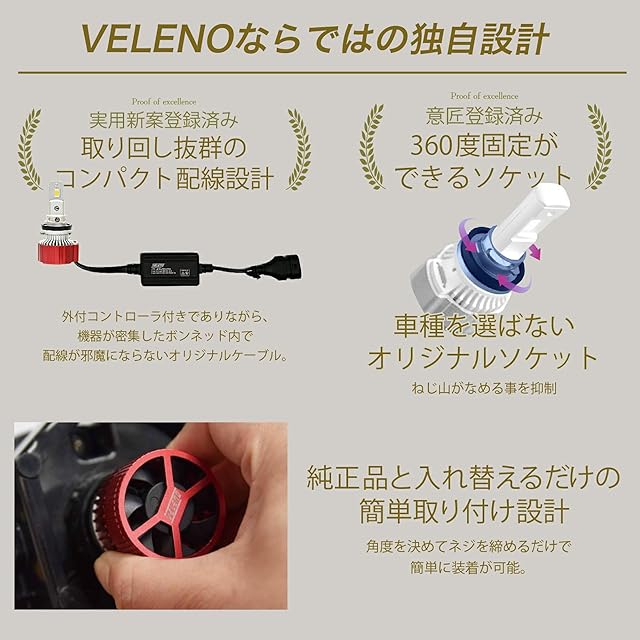 【簡単な取り付けと独自設計の技術の結晶】純正球を外して取り替えるだけの簡単交換。誰でも簡単に純正バルブと交換できます。実用新案登録済みのコンパクト配線設計や意匠登録済みの360度固定ができるソケットなどVELENO独自の技術が詰まった究極のLEDバルブです。ハイブリッド車対応の設計により、電圧変動の大きい車両でも安定した明るさを維持します。