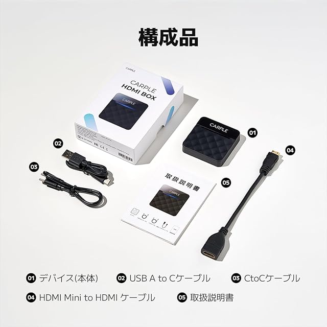 ⚡【簡単セットアップ】面倒な設定や専用アプリのインストールは不要です。本体は車両のデータ用USBポートに付属のUSB to Cケーブルで接続します。HDMI機能は、同梱のHDMI Mini to HDMIケーブルを、本体の「HDMI IN」ポートに差し込み、もう一方の標準HDMI端子をHDMI機器に接続してください。 ワイヤレスCarPlayは、車載モニターからCarPlayを選択し、iPhoneのBluetoothをオンにして、表示されるCarpleのBluetoothを選択してください。スマートフォンのミラーリングは、スマートフォンに対応するHDMI変換ケーブル(別途購入)をご用意のうえ、スマートフォンと本製品のHDMIポートを接続してください。