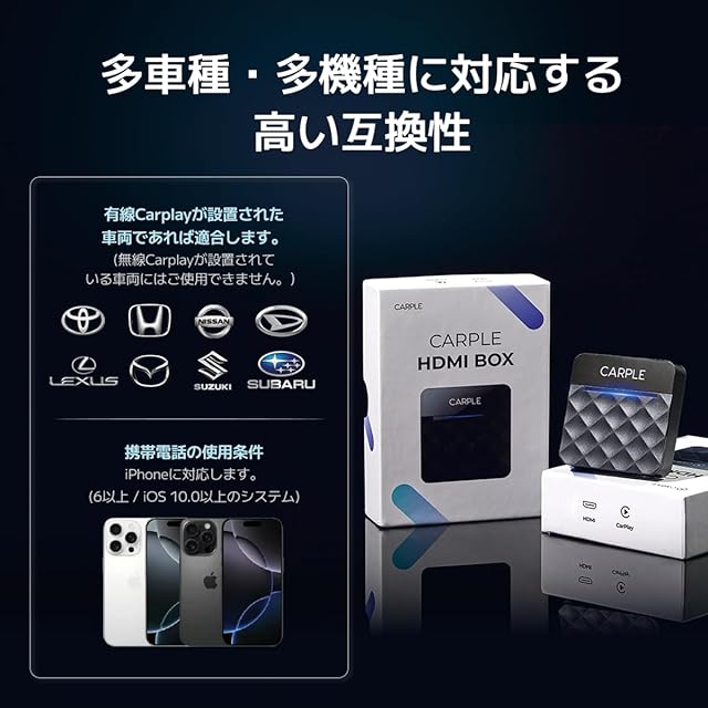 【3in1アダプターで車載エンタメ環境を完成】CARPLE HDMI BOXは、有線CarPlayを標準搭載している車両に対応し、3機能でドライブ時間をより快適に変えます。「HDMIポートを搭載」:TVスティックやストリーミング機器と接続することで、YouTubeやNetflixなどの映像コンテンツを車内モニターに出力できます。「スマートフォンのミラーリングに対応」:スマートフォンの画面を車内モニターにミラーリング表示できます。(※接続には別途ケーブルが必要)。「有線CarPlayの無線化」:面倒なケーブル接続なしで、ワイヤレスCarPlayへ簡単にアップグレード可能。