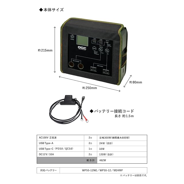 DC12V用ディープサイクルバッテリーを使用して、AC100V・USB5~12V・DC12Vの電源を取り出せる。