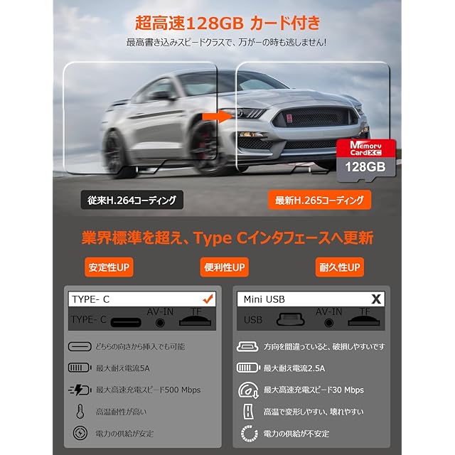 【便利な自動上書き録画機能:128GBMicro カード付属✨Type-C電源に進化:充電速度&安定性&耐久性アップ!✨TS形式録画保存技術✨】➊クラス10規格の高耐久性カードを採用、頻繁な「書き換え」や「繰り返し」を行っても、重要な証拠破損・消失が発生 しません。カードが付属されているので、すぐに使えてストレス感じません。➋今回の新作VANBAR DC209Proは初めてType-C電源ケーブルを採用しております。従来のType-Bと比べて「充電速度」や「安定性」、「便利性」、「耐久性」、「耐熱性」などが向上します。電源が落ちる、電源入らない、再起動、炎天下高温変形など以前の痛点を一発完璧に解決しました。❸従来のビデオ形式であるMOVをTSにアップグレードしました。TS(MPEG2-TS)形式は転送速度がもっと速くて、録画エラーが発生したり、データの欠落を防ぎ、長時間録画保存が可能に!