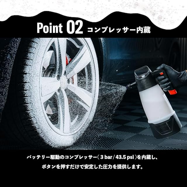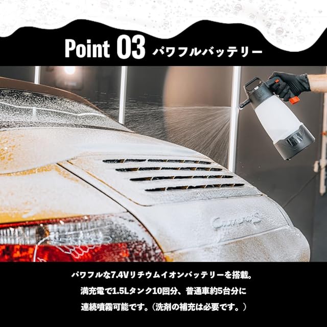 ポイント03:パワフルバッテリー パワフルな7.4Vリチウムイオンバッテリーを搭載。満充電で1.5Lタンク10回分、普通車約5台分に連続噴霧可能です。(洗剤の補充は必要です。)