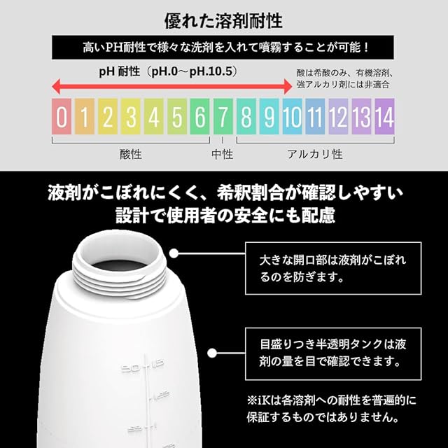 ポイント04:優れた溶剤耐性 高いPH耐性で様々な洗剤を入れて噴霧することが可能!※酸は希酸のみ、有機溶剤、強アルカリ剤には非適合。※iKは各溶剤への耐性を普遍的に保証するものではありません。