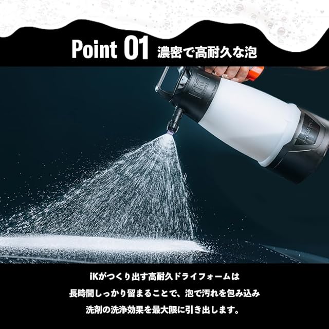 ポイント01:濃密で高耐久な泡 iKがつくり出す高耐久ドライフォームは長時間しっかり留まることで、泡で汚れを包み込み洗剤の洗浄効果を最大限に引き出します。