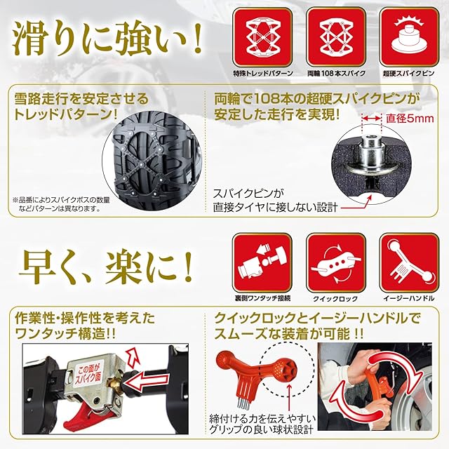 【安心してご使用いただける理由その3】スパイクピンを超硬材質&マカロニ型にすることで、アイスバーンへの食い付きを飛躍的に向上させました。アイスバーンへの性能は、降雪翌日の都市部でも威力を発揮します。・丈夫で長持ちの高性能ポリウレタンエラストマーを採用。耐久性 jasaa基準の1.5倍(自社基準)