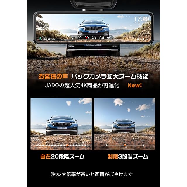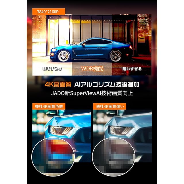 ご注意ください: お客様の声を重視し、24年5月10日商品カメラの明るさをアップし、WDRの強力光抑制機能を低減し、64Gbフラッシュメモリを付属しました。2023年10月23日バックカメラに拡大ズーム機能を追加しました、バージョン変更に伴いまして、皆様にはご不便とご迷惑をおかけしますが、何卒ご理解ご協力のほど、よろしくお願い申し上げます。 【4K超高画質 ミラー型ドライブレコーダー】JADO G810+4K人気のデジタルインナーミラー最新の進化です、搭載AIアルゴリズムとSuperView画像処理技術を組み合わせることで、より高コストな部品による画質と伝送の向上、最終的には満足できる画質に向上し、WDR/HDRの眩しい光を低減せずに自動調整することで、通常の2160P 4Kフロントカメラよりも30%ほど鮮やかな色味を実現しました。夜の照明がそれほど悪くない場合でも、色の鮮やかさは15%以上アップできます。バックカメラにはWDRで眩しい光抑制機能がありますので、フロントカメラよりも暗くなりますが、正常な状態でご心配しないでください。