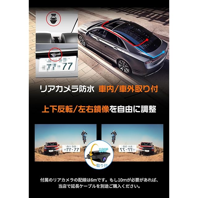 【防水リアカメラ上下反転&取り付簡単&電波障害対策】バックカメラは防水で、車内・車外ともに使用可能で、 取付キット付属です。後ろ録画を上下反転させることができるので、リアカメラを180°反転させることができるので設置が簡単です。リア配線6m付属、ルーフ配線なら普通の車種で6mあれば十分、10mケーブルが必要な場合は、弊社延長ケーブルを別途お求めくださいます。ドラレコ本体やケーブルなどにノイズ対策が施され、電磁波が外部環境への漏洩を防ぐための対策も行なってカーナビ、地デジ等に影響を及ぼさないようにしています。注:増設したカーナビは対策が不十分なため、干渉する場合があります。10M延長コード「別売B08JHXYJT1」