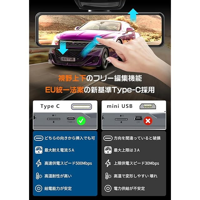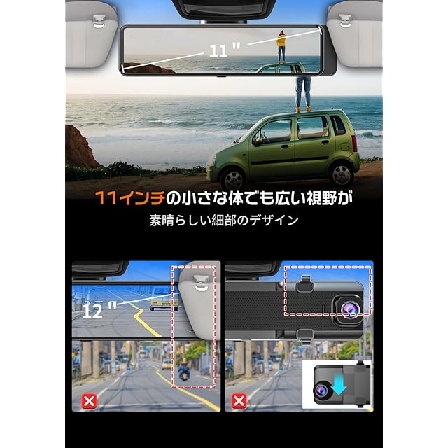 【日本車適合11インチのドラレコ ミラー型】なぜ「11インチ」ですか?従来の10インチの場合、幅が短くルームミラーをカバーしきれない場合があり、12インチの場合、幅が長すぎて車種によりサンバイザーと干渉することが発生しておりました。検討と実施を重ねた結果、サンバイザーと干渉することがない「11インチ」へ改良されました。画面スケールが完璧なため、12インチ表示の横幅と同じで、12インチのように物体が変形することはありません。スクリーンが大きくて重いという問題も解決されます。