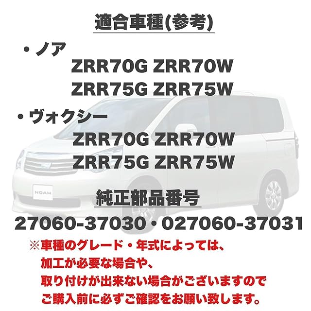 【適合車種(参考)】 トヨタ ・ヴォクシー ZRR70G ZRR70W ZRR75G ZRR75W ・ノア ZRR70G ZRR70W ZRR75G ZRR75W ※車種のグレード・年式によっては、加工が必要な場合や、取り付け出来ない場合がございますのでご購入前に必ずご確認をお願い致します。