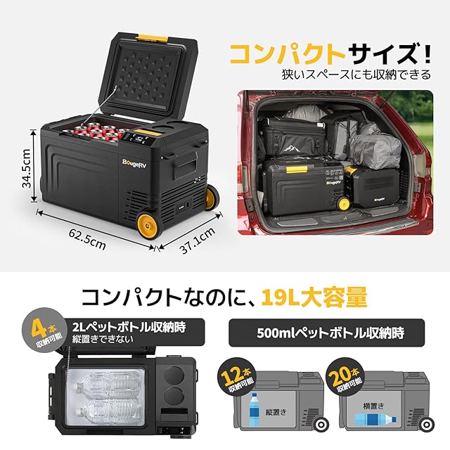 【19Lの大容量・コンパクトサイズ】弊社のCRD Mini 19Lポータブル冷蔵庫は、コンパクトながら19Lの大容量です。350mlの缶は25缶、500mlのペットボトルは20本、2Lのペットボトルは4本まで収納可能です。冷蔵庫の内寸は31.7×24.7×24.8cmで、外寸は62.5×37.1×34.5cmです。小型サイズのため軽自動車やコンパクトカーにも設置できます。