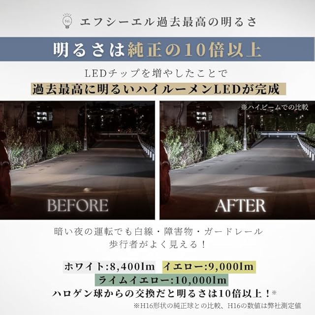 【時間が経ってもずっと、驚くほど明るい!】 エフシーエルのledは点灯直後から安定後もほとんど明るさは落ちません。点灯数分で大幅に暗くなるものではなく、明るい状態をキープできるLEDを開発しました。純正ライトと比較するとその差は10倍以上(h16形状の純正球と比較。h16の数値は弊社測定値)。国内の第三者機関にて商品のルーメン数を計測を行っています。車のライトが一番明るく光る点灯直後のルーメン数ではなく、ルーメン数が安定した5分後の明るさ=実際に道路などを照らす明るさをルーメン数として設定しています。実測ルーメンが同じくらいの他社製品のライトを計測してみましたが、他社製品は点灯直後に比べ20%も明るさがダウン。エフシーエルは安定後も明るさを高い水準で維持することができています。LED商品は全て点灯直後が明るく数分で明るさが減少した後に安定します。点灯直後も同じ明るさを維持することはLEDの仕様上できません。そのためルーメン数の表記はご注意ください。