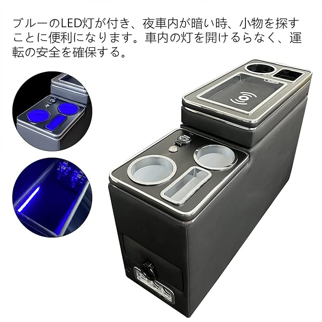 最新型コンソールボックス:1.ティッシュ収納ボックスも設置しており、収納スペースを増えます。2.ブルーのLED灯が付き、夜車内が暗い時、小物を探すことに便利になります。車内の灯を開けることが要らなく、運転の安全を確保する。3.前席+後席に 5口USBポートを増設、後部座席の乗客にも便利になります。