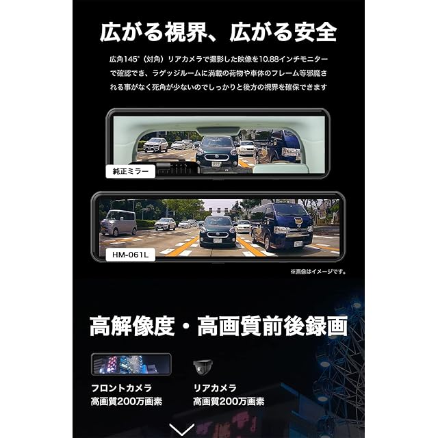 【 Hm-061Lの商品特徴 】 次世代デジタルルームミラー型ドライブレコーダー「ミラビュー Hm-061L」の新登場になります。これからドライブレコーダーを検討するのにお勧めするリーズナブルモデルになります。標準GPSを搭載し、前後とも200万画素の高画質ドライブレコーダー、迷ったら、コレをご検討ください。