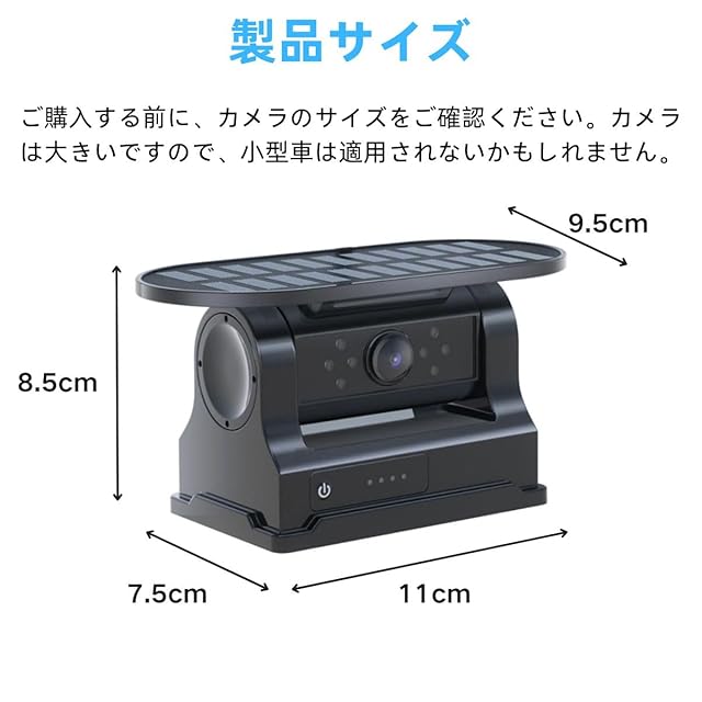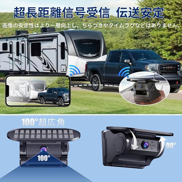 【超長距離信号受信】バックカメラ ワイヤレス ソーラー は長さが15メートル以内の車両に適しています。障害物のない場所で最大約100mの広範囲の性能により、トラックやトレーラーなどでも問題なく使用できます。※本製品はスマホのみ対応です。ご購入する前にカメラのサイズをご確認ください。カメラは大きいので、普通の乗用車には向いていません。