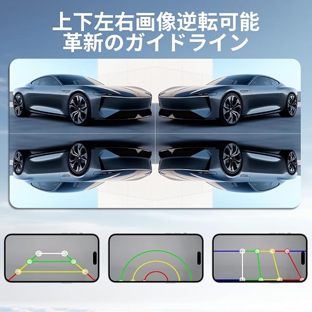 【革新的なガイドライン&上下左右画像逆転可能】バックカメラ ワイヤレスのガイドラインタイプには、水平台形、半円形、左水平ライン、右水平ラインがあります。表示・非表示を選択できるだけでなく、上下の高さ、幅、左右の向きを調整することもできます。また、必要に応じで表示モードは正像・鏡像・アップ・ダウン画像に自由に切替できます。