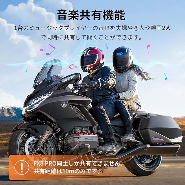 【音楽共有&ユニバーサル接続&FMラジオ付きいんかむ】ミュージックシェア機能搭載しており、1台のミュージックプレーヤーの音楽を夫婦や恋人や親子2人で同時に共有して聴くことができます※音楽共有距離は10Mです。2台FX8 PROの間で音楽共有しかできません。インターコム通話中にミュージックシェアは不可。「ユニバーサル接続」Fodsports製インカムと接続だけでなく、他の大手メーカーのインカムとも繋がる可能です。スマホ、ナビゲーション、トランシーバー、バイクブルトゥースイヤホンとのペアリングもできます。「FMラジオ付きインカム」76~108MHzの周波数なので、ワイドFMラジオ(FM補完放送)対応、日本全国内にFM放送受信可能です。ソロツアーで音楽中心の番組、ニュース・天気予報、交通情報、スポーツ中継などの番組ジャンルを自分の好みに合わせて選択できます。