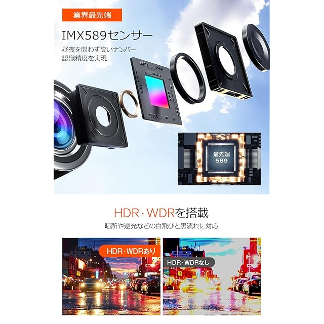 【IMX589センサー & HDR/WDR & 地デジノイズ対策】このドライブレコーダーには高感度のIMX589センサーが搭載されており、HDR(ハイダイナミックレンジ)およびWDR(ワイドダイナミックレンジ)の画像補正技術により、暗い環境でも鮮明な映像を記録することが可能です。夜間走行時やトンネル内でも、ナンバープレートや標識、周囲の車両の動きをしっかりと捉えることができ、昼夜問わず安心して使用できます。また、地デジノイズ対策が施されているため、車内で地デジ放送を視聴する際にも干渉を受けにくく、快適に使用できます。このノイズ抑制機能は、車内の電子機器との相性を考慮した設計となっており、ドライブ中のエンターテインメントを妨げることなく安心してお楽しみいただけます。
