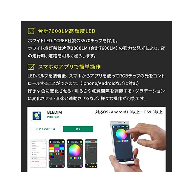 【使い勝手の良い2種類のチップ搭載&純正の配光を再現したバルブ】LEDチップの下に、様々なカラーに変更出来るRGBチップを装備。ホワイトLEDにはCREE社の3570chipを採用し、片側3800LM(合計7600LM)の強力な発光で道路を明るく照らします。RGBチップはスマホのアプリで自由に色を変更可能。また、H4バルブは純正はハロゲンランプと同じ長さ、同じ配光位置で設計し、純正の配光をほぼ再現しました。純正と同じ位置から発光するので、ライトのリフレクターにも理想的な角度で反射します。