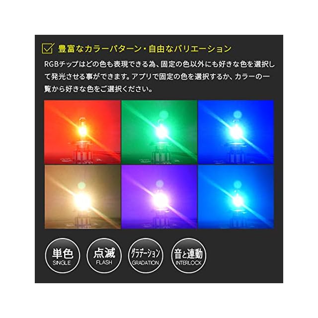 【スマホでライトの色を簡単切替】LEDバルブを装着後、スマホからアプリを使ってRGBチップの光をコントロールすることが出来ます。RGBチップはどの色も表現できる為、固定の色以外にも好きな色を選択して発光させることが可能。アプリで固定の色を選択するか、カラーの一覧から好きな色をご選択ください。また、色変化だけではなく、明るさや点滅間隔の調節、グラデーション変化、音楽との連動など、様々な操作が可能です。バルブ本体にメモリー機能がある為、再点灯時にも最後に点灯したカラーで点灯します。※RGBを点灯させて公道を走行することは違法です。公道ではなく、利用可能なサーキットやイベント会場等でご活用ください。