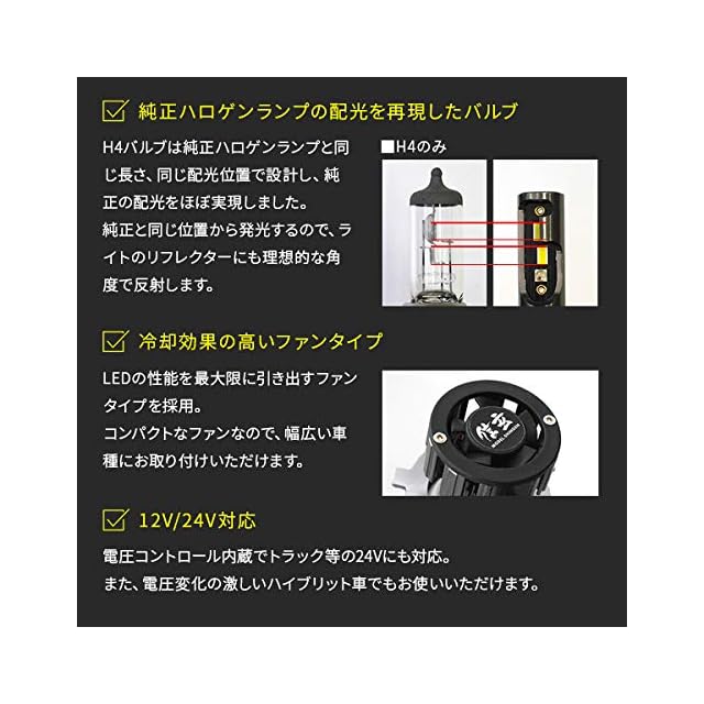 【冷却効果の高いファンタイプ&電圧コントロール内蔵で幅広い車種に対応】LEDの性能を最大限に引き出すファンタイプを採用。コンパクトなファンなので、幅広い車種にお取り付けいただけます。また、電圧コントロール内蔵でトラック等の24V車にも対応。電圧変化の激しいハイブリッド車にも安心してお使いいただけます。