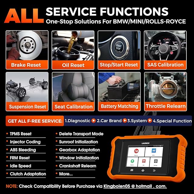 【すべてのメンテナンスサービス】 BMW/ミニ/ロールスロイスに適合するLAUNCH X431 Elite 2.0 PRO診断スキャナは、オイル/EPBリセット、ABSブリーディング、アイドル速度、D.PF再生、車高調整、自動スタートを含むすべてのサービスを提供します。 停止、トランスミッション再学習、トランスポートモードの削除など。BMW車専用のバッテリー登録ツールでもあります(異なるタイプと容量にも対応)。 「診断>自動検索>特殊機能」からすべてのサービスを取得してください。 購入前に互換性を確認してください。