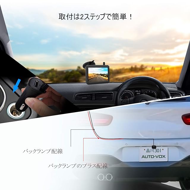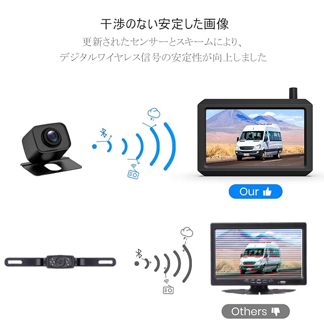 【ワイヤレスで取付は超カンタン】カメラに無線送信機が内蔵されているので、ケーブルでモニターとカメラなどの接続配線は一切不要です。取付はたった3つのステップで完了:①モニターをフロントガラスまたダッシュボードに設置します。 ②リアカメラをナンバープレートに取り付けます。③電源ボックスをバックランプに接続します。素人でもインストールできて、お時間と設置費用が節約できます。製品は技適マークが付いて日本の電波法に適合します。(周波数:2.4GHz)