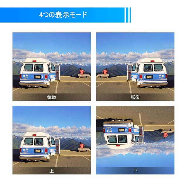 【6つの駐車ライン&4つの表示モード】 ガイドラインは車種と駐車場所によって自由に選択できますので、後退時のガイドラインは表示、非表示を選択でき、表示の場合には6つのパターン用意しているので、最適なガイドラインを選択することができます。必要に応じで表示モードはミラー・オリジナル・アップ・ダウン画像に自由に切替できます。例え間違って取り付けられた場合でも、カメラを再び取付の必要はなくて、モニター側のメニューで適切な画像を設置するだけで済みます。