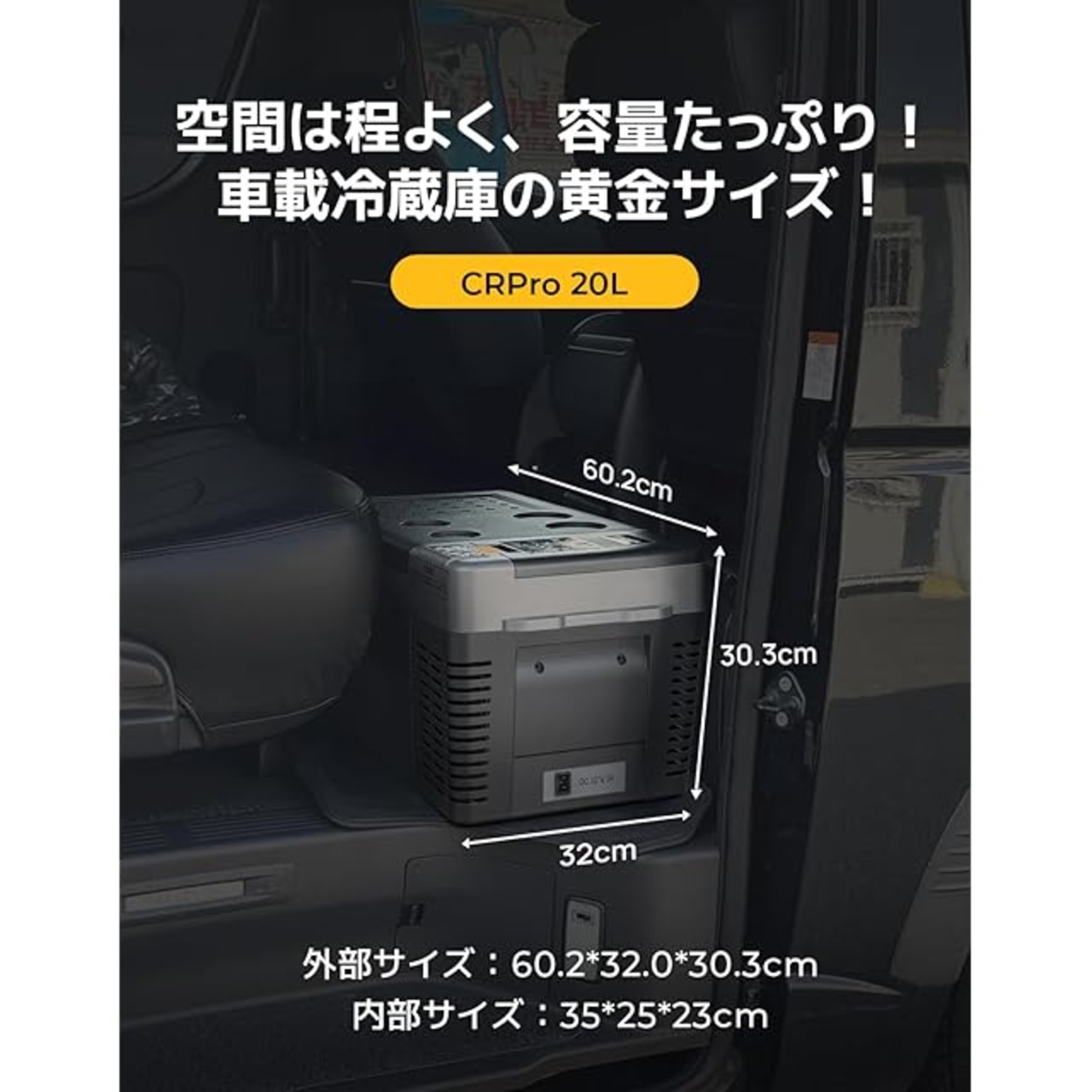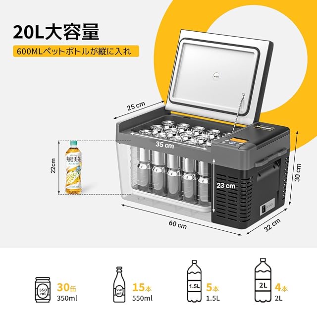 【20L大容量&コンパクト設計】コンパクトながら20Lの大容量!350mlの缶ビールなら22本、500mlのペットボトルなら15本、2Lのペットボトルなら4本も入れられます。内部サイズは幅35cm×奥行25cm×高さ23cm、外部サイズは幅60.2cm×奥行32.0cm×高さ30.3cmです。小型車やコンパクトカーの座席でも簡易に取り付けでき、どこへでも持ち運びが便利です。