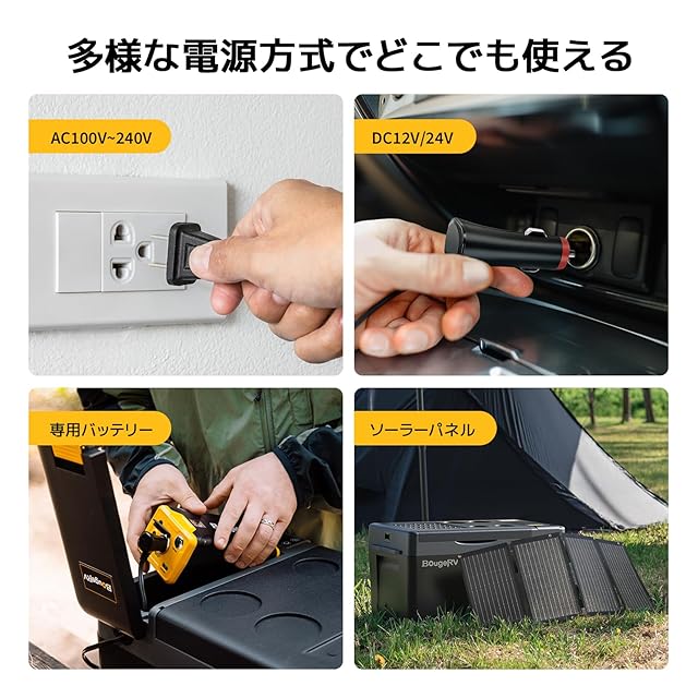 【家庭でも車内でも快適!】 AC電源(100V-240V)とDC電源(12V/24V)の両方に対応しており、室内はもちろん、軽自動車から大型トラックまでも幅広く対応可能。45dBの静音設計なので、寝室や車中泊時にも睡眠を妨げることはありません。