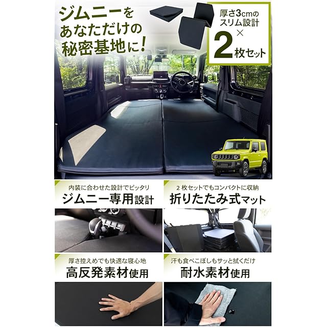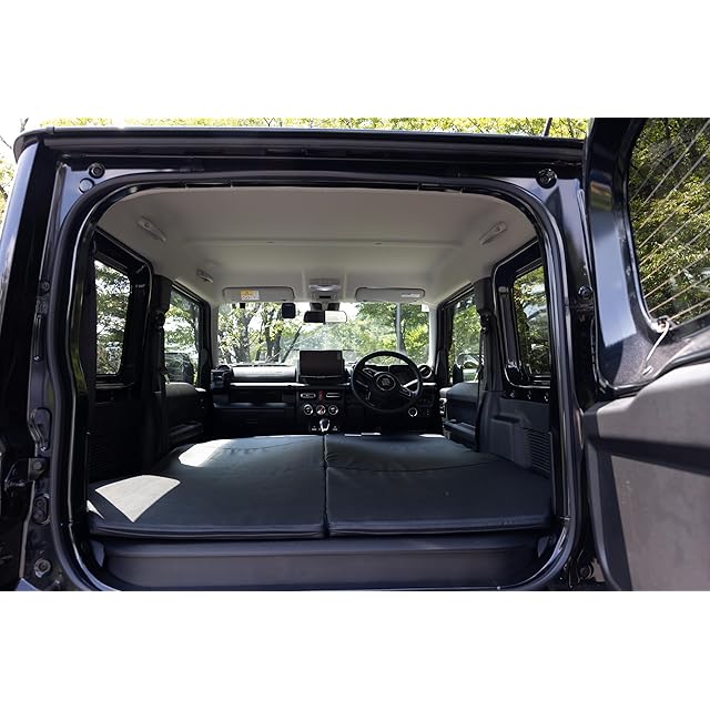 「新型ジムニーで快適に車中泊を楽しみたい」——そんな願いを叶える、ジムニー専用の車中泊マット(厚さ3cm・2枚セット) です。ジムニーの内装にフィットする設計で、車内の段差をしっかり解消。倒した座席の上に敷くだけで、簡単にフルフラットのベッド空間が完成し、まるで自宅のような快適な寝心地を実現します。