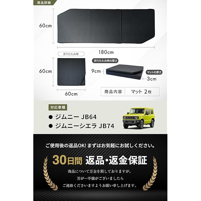 安心の30日間返品保証 「本当に快適に使えるか不安…」という方のために、30日間の返品保証付き。未使用はもちろん、使用後でも返品対応可能 なので、安心してお試しいただけます。 ジムニーでの車中泊を、より快適にするための必須アイテム。この機会にぜひご検討ください!