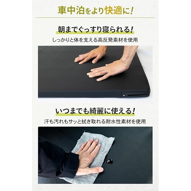 高反発×適度な厚みで快適な寝心地 約3cmの高反発マットレス を採用し、適度な弾力で身体の沈み込みを防止。長時間寝ても体が痛くなりにくく、快適な車中泊をサポートします。
