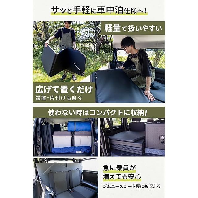 対応車種・サイズ 【対応車種】 ・ジムニー JB64 ・ジムニーシエラ JB74 【商品サイズ】 展開時:180cm × 60cm × 3cm(1枚あたり) 折りたたみ時:60cm × 60cm × 9cm(1枚あたり) ※対応車種以外では使用できませんので、購入前に必ずご確認ください。