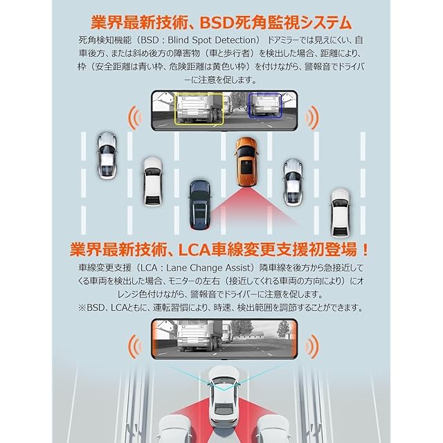 【業界唯一のBSD死角監視システム&LCA車線変更支援初登場!】 ➊死角検知機能(BSD:Blind Spot Detection) ドアミラーでは見えにくい、自車後方、または斜め後方の障害物(車と歩行者)を検出した場合、距離により、枠(安全距離は青い枠、危険距離は黄色い枠)を付けながら、警報音でドライバーに注意を促します。 ➋車線変更支援(LCA:Lane Change Assist) 隣車線を後方から急接近してくる車両を検出した場合、モニターの左右(接近してくれる車両の方向により)にオレンジ色付けながら、警報音でドライバーに注意を促します。※BSD、LCAともに、運転習慣により、時速、検出範囲を調節することができます。