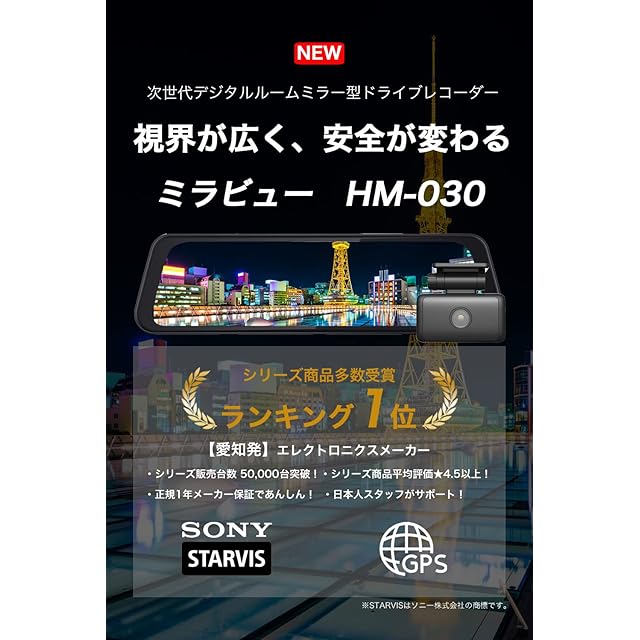 【 Hm-030の商品特徴 】 次世代デジタルルームミラー型ドライブレコーダー「ミラビュー HM-030」の新登場になります。標準GPSを搭載し、sony starvisを採用した前方360万画素の高画質ドライブレコーダーになります。