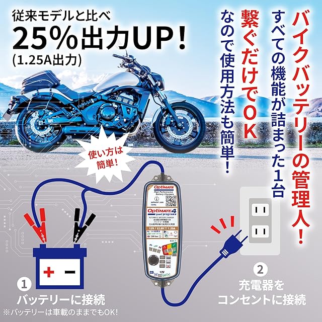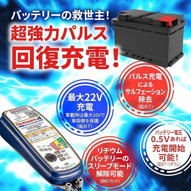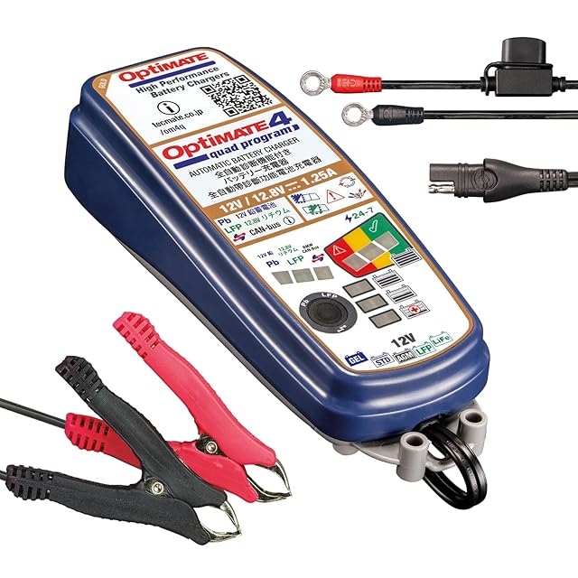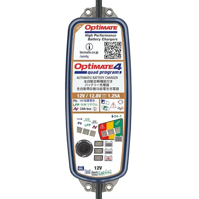 【テックメイト公式】2023年秋新型!オプティメイト4Quadクアッド・プログラム 12.8Vリン酸鉄リチウムイオン/12V鉛電池兼用充電器。BMW motorrad キャンバス対応、トライアンフ、Ducati Mutistrada用 Canbus充電機能、3段階強力回復充電機能搭載 (通常版(オプションケーブル無し))