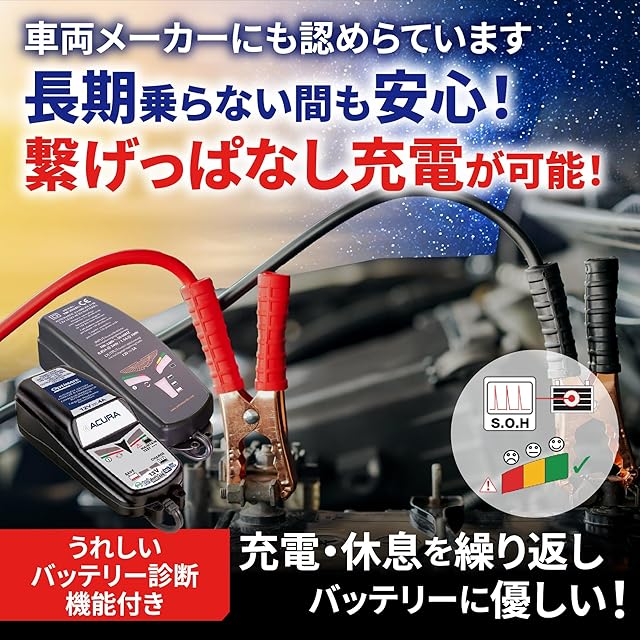 バッテリー回復機能、バッテリー診断機能、ショート防止機能、キャンバス(ヘラーソケット)経由充電機能*別売りO09ヘラーソケット・ケーブルが必要です