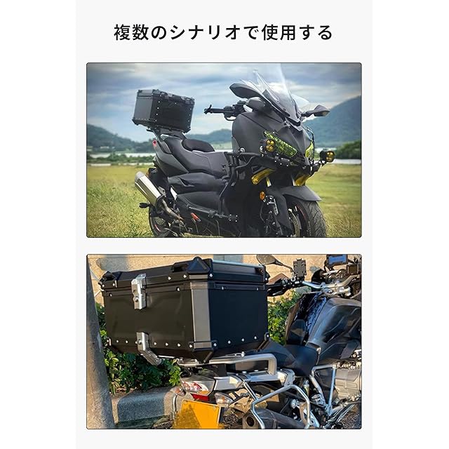 【盗難防止の二重ロック】上下2重ロック設計、リアボックス自体にロックがかかっている際と取り付けているベースともロックがかけるとフタが開かなくなり、ロック設計により、ロックが掛かっている状態だと強引に外せないです。荷物とリアボックス両方を盗難被害から防ぎ、盗難リスクの心配も少なくなります。旅行中や買い物中にバイクを置き去りにすることができる、携帯する必要はないリアボックス。