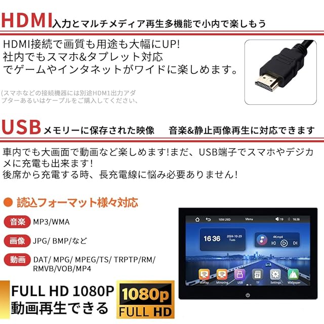 【ヘッドレストモニター&10.1インチ性能も大幅にup!】HDMI入力とUSB/SDマルチメディア再生多機能で車内で楽しもう。HDMI接続で画質も用途も大幅にup!車内でもスマホ&タブレット対応でゲームやインタネットがワイドに楽しめます!USBメモリーに保存だれた映像・音楽など再生対応できます。また、USB端子でスマホやデジカメに充電できます!