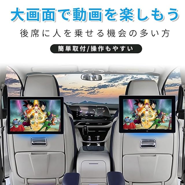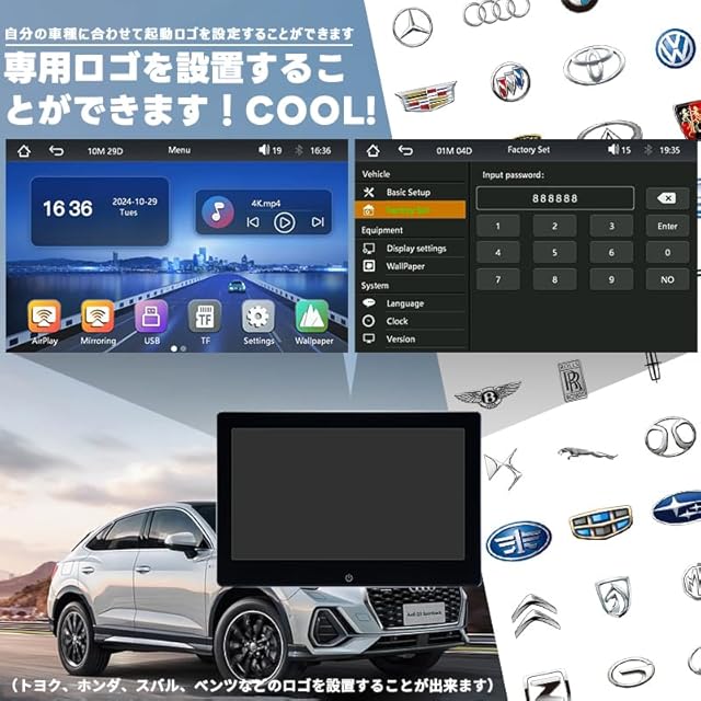【視聴角度調整・取付簡単・お車でもご家庭でも楽しめる】●角度調整できて、好きな体势で見やすい角度に調整実現します。●取付簡単:従来のヘッドレストモニターと違って、工具も必要なくあらゆるサイズのヘッドレストに簡単に取付け可能です。シャフトに装着するタイプなので、スッキリコンパクトです。●車logo設定のパスワードは888888です。