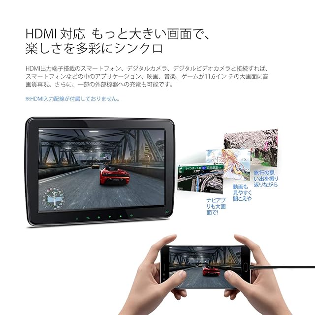【充実な基本機能】HDMI入力・USB/SDカードで多種なフォーマットが再生可能な後席モニターです。AV入力対応なので、付属のAUXケープルを接続して、ナビ/チューナーからの映像が鑑賞できます。